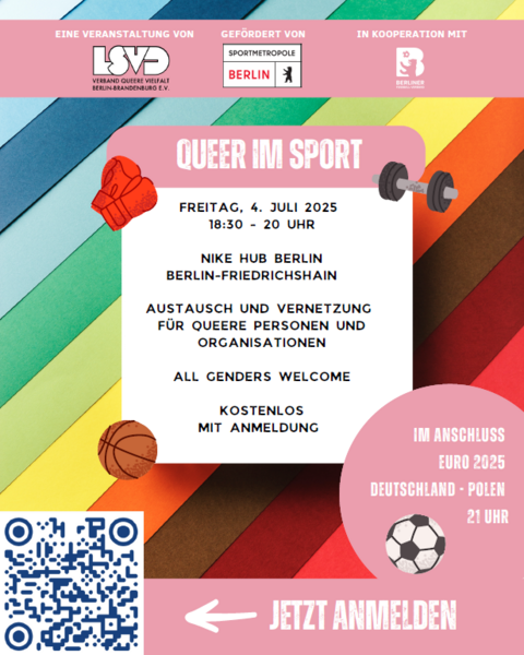 Die Kompetenz- und Koordinierungsstelle für geschlechtliche und sexuelle Vielfalt im Sport wird getragen vom LSVD Verband Queere Vielfalt Berlin-Brandenburg und gefördert von der Senatsverwaltung für Inneres und Sport. Queer im Sport wird in Kooperation mit dem Berliner Fußball-Verband organisiert.