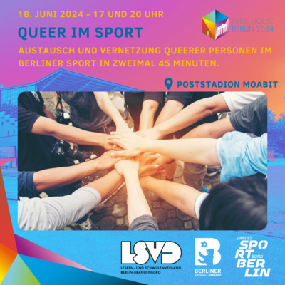 Du bist queer und sportbegeistert? Dann komm vorbei und teil uns deine Meinung mit. In zwei Runden à 45 Minuten wollen wir uns kennenlernen und austauschen. Wir wollen von euch wissen: Wie können Vielfalt und Teilhabe im Sport gelebt werden? Was brauchen queere sportbegeisterte Personen, um in Berlin gut und gerne Sport treiben zu können? Was läuft schon gut, was kann und soll verbessert werden? Teile uns deine Meinung zum Berliner Sport aus deiner queeren Perspektive mit. Bei Interesse können im Anschluss die Spiele der Fußball-EM der Männer auf großer LED-Wand gemeinsam geschaut werden.