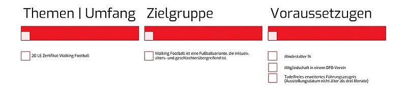 Im Kurs erwirbst Du Kompetenzen für die Planung, Durchführung und Reflexion von Trainingseinheiten mit Walking-Football-Spieler*innen, immer im Kontext Deiner Gruppe und im Einklang mit den DFB-Richtlinien. Die Inhalte orientieren sich am Alltag im Amateurfußball und sind so gestaltet, dass Du sie direkt in Deinem Verein anwenden kannst.